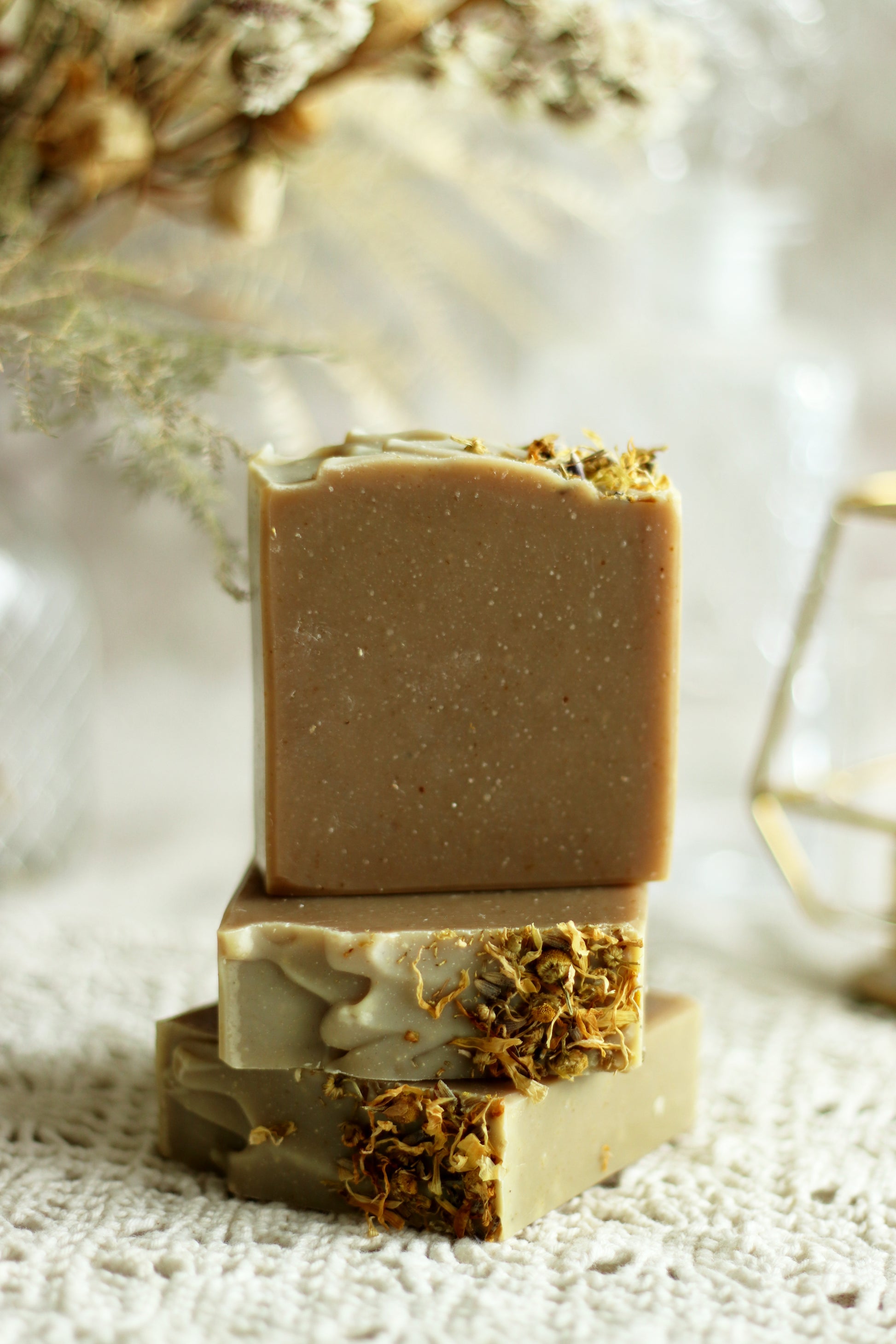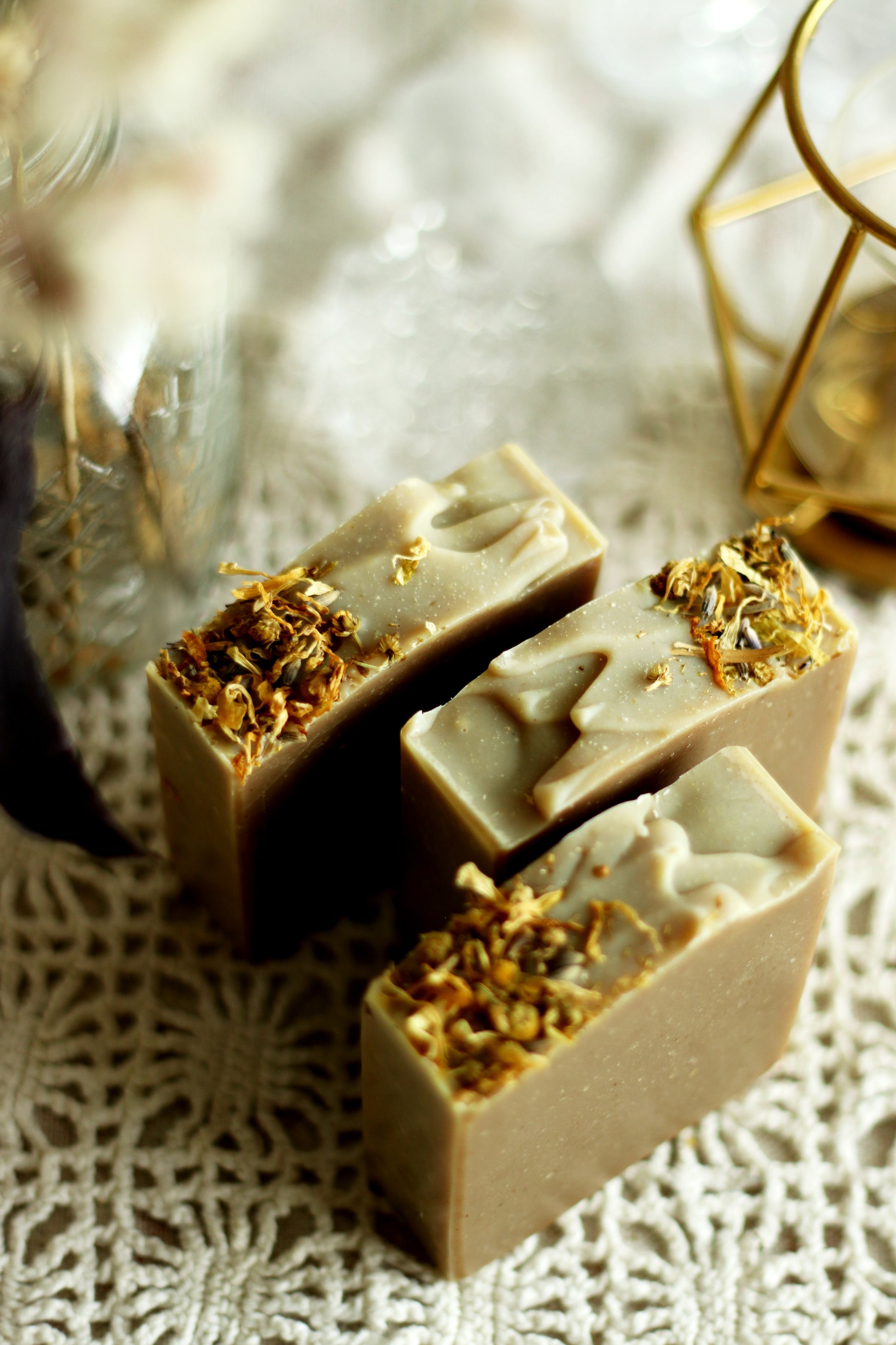 Ingredients: Organic coconut oil, olive oil, avocado oil, palm oil, water, sodium hydroxide, organic coconut milk, organic chamomile flowers, organic calendula petals, pure essential oils (hyssop, orange, lemon, sage, lavender, lemongrass, helichrysum), lavender flowers, rose petals